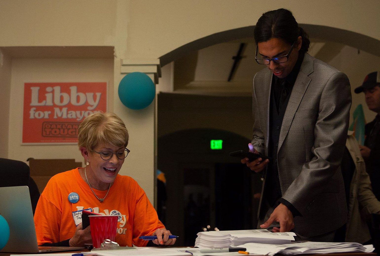 In front of the crowd, Schaaf read off her iPhone. “We are in the lead at 65 percent,” she said less than an hour after the polls closed. Cheers erupted and those closest to the mayor started chanting “Libby! Libby! Libby!”