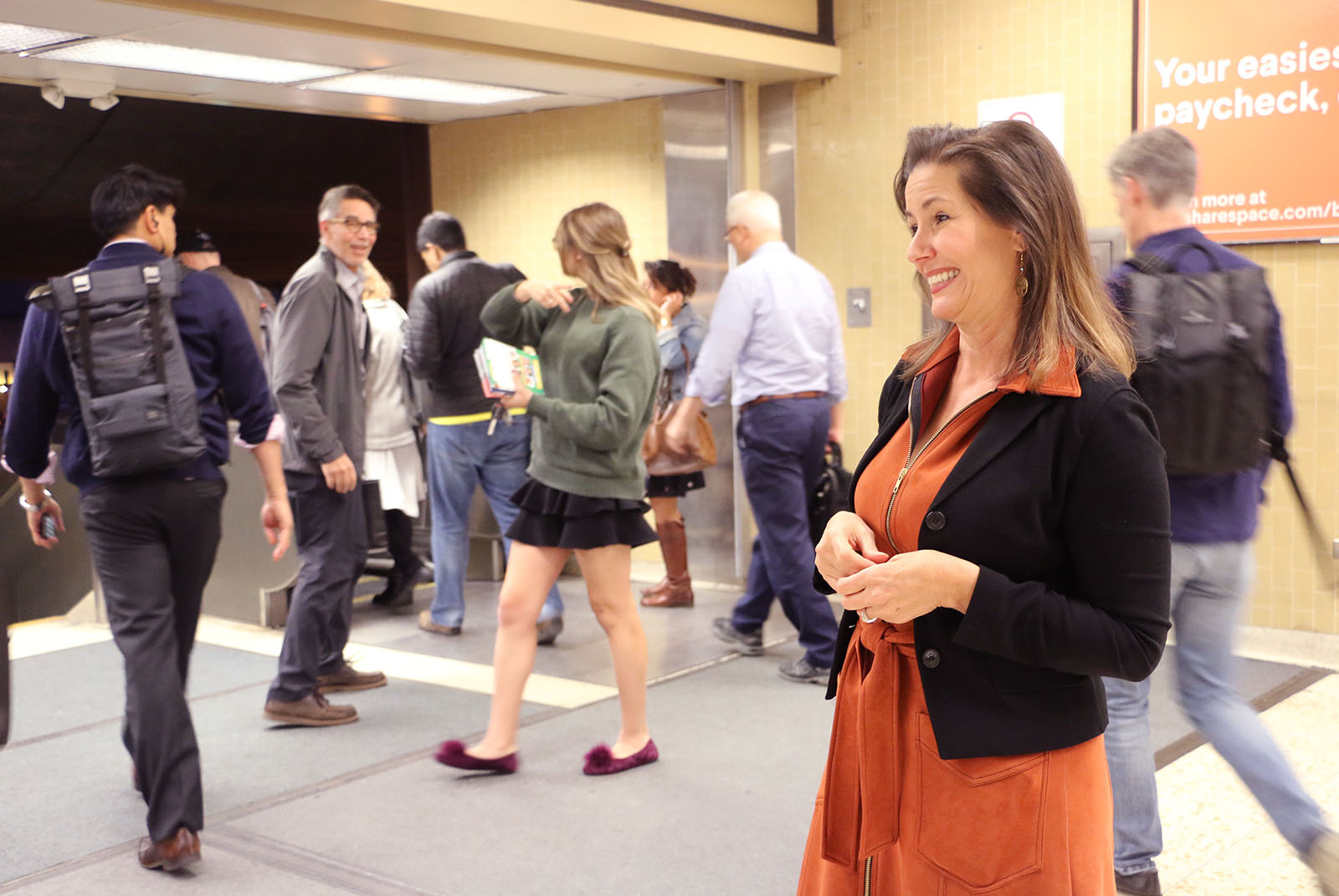 - In the hours before polls close, Mayor Libby Schaaf asks commuters at Rockridge Bart Station if they’ve voted. Photo by Katey Rusch.