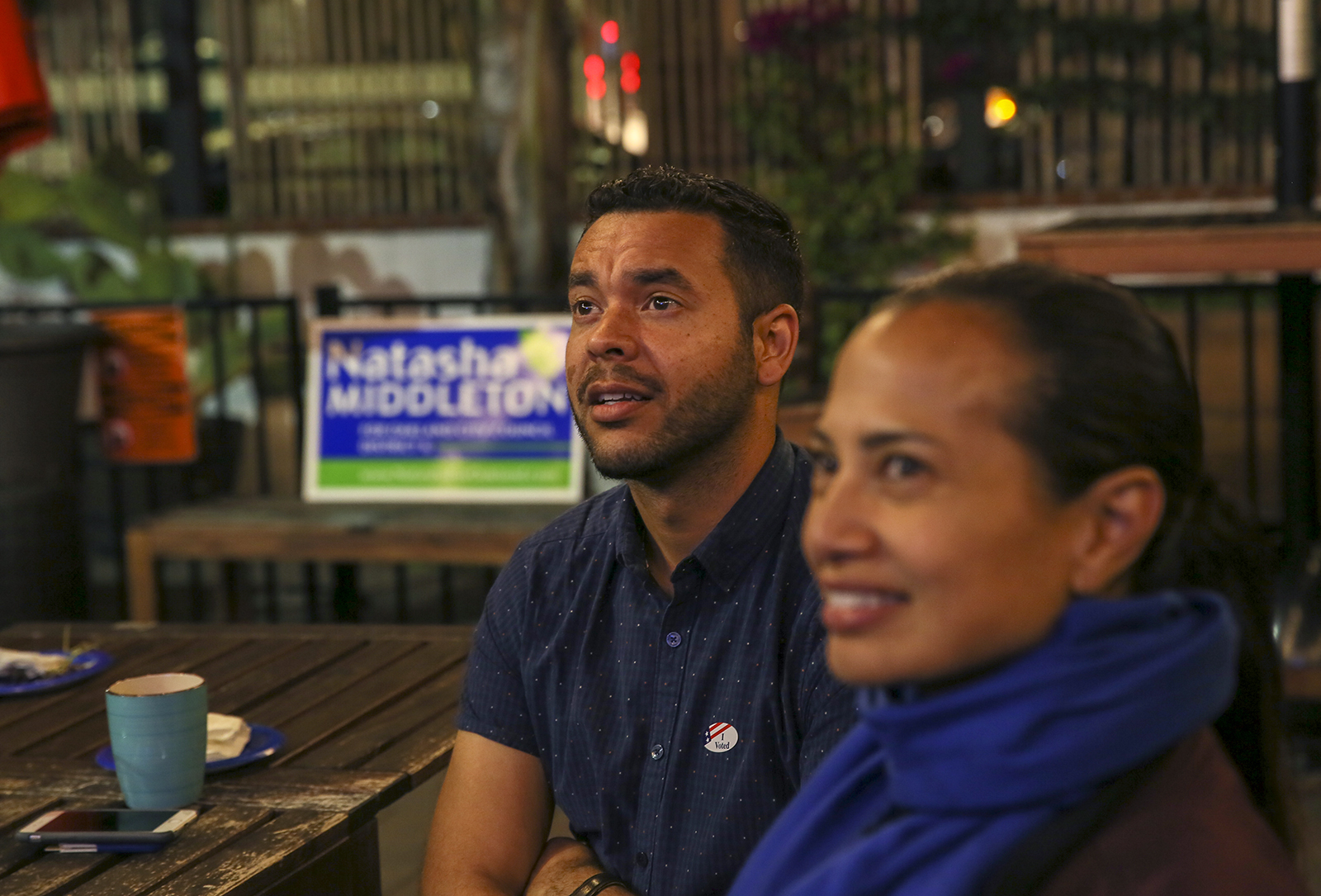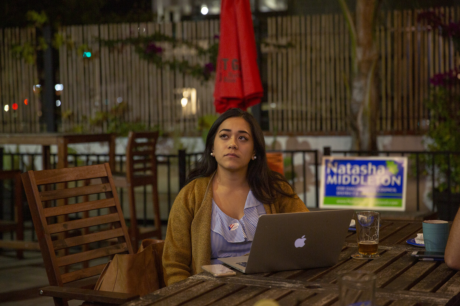 Around 8 p.m., Natasha Middleton’s watch party remained a quiet affair. In the colorfully decorated garden of the Aloha Club in Oakland, a handful of campaign staff checked their phones and watched CNN on a large television screen. “I wouldn’t be a very good campaign manager if I wasn’t optimistic [for Natasha]” said campaign manager Lily Achatz.