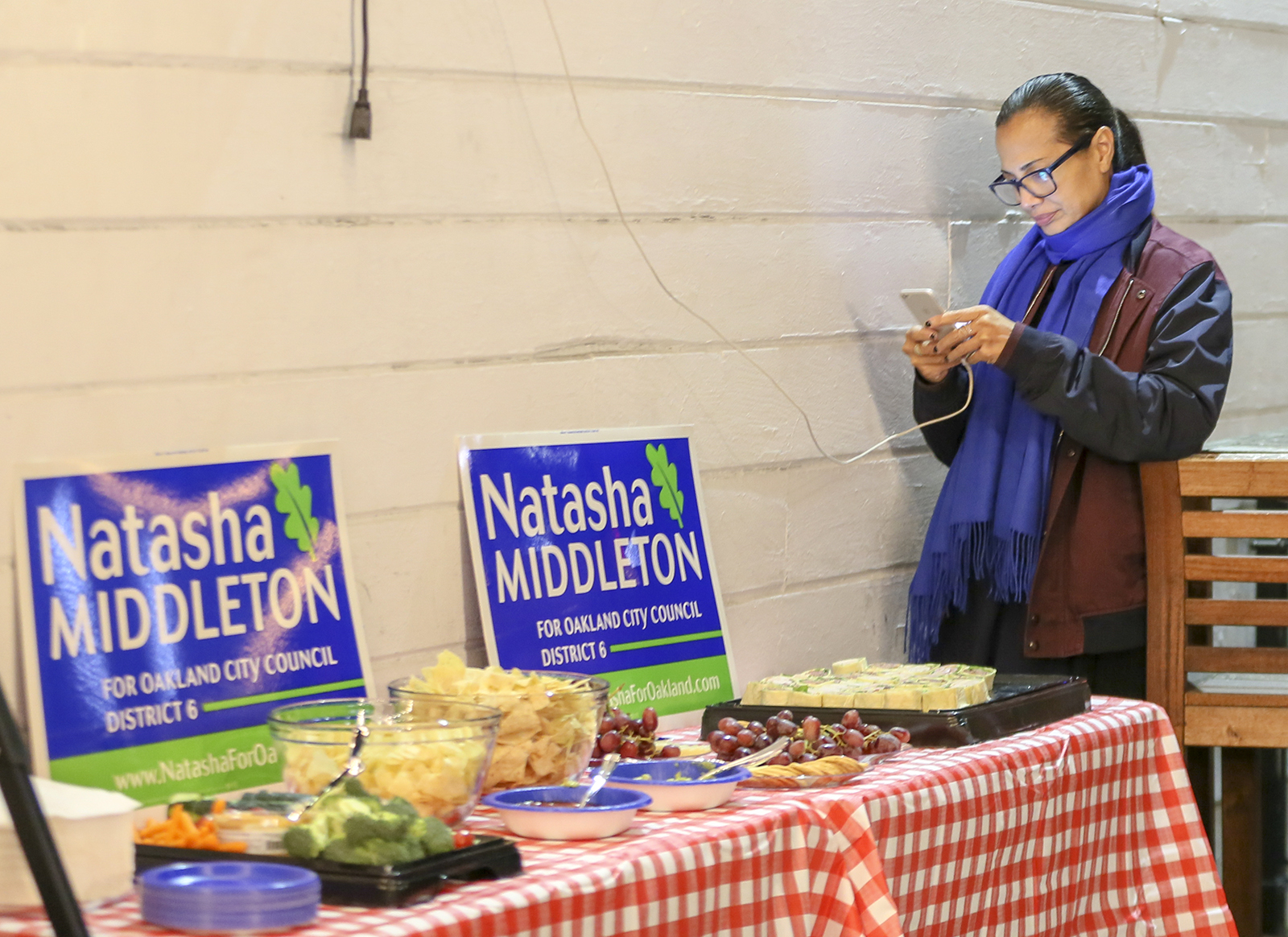 - Lily Achatz, campaign manager for Natasha Middleton, checks her phone at an election party for Middleton in Aloha Club in East Oakland. Photo by Drew Costley