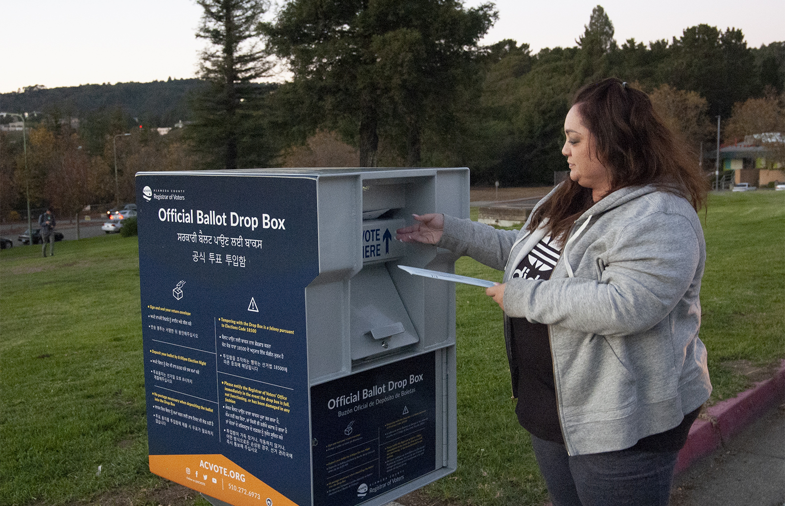 - Carolyn Anteneh stopped by the ballot drop box at Samuel Merritt College to turn in her ballot as well as her husband’s. She said there was nothing on the ballot she felt particularly strongly about, and that “the ballot was confusing. It felt like I was in college again!” she said. Photo by Sarah Trent.
