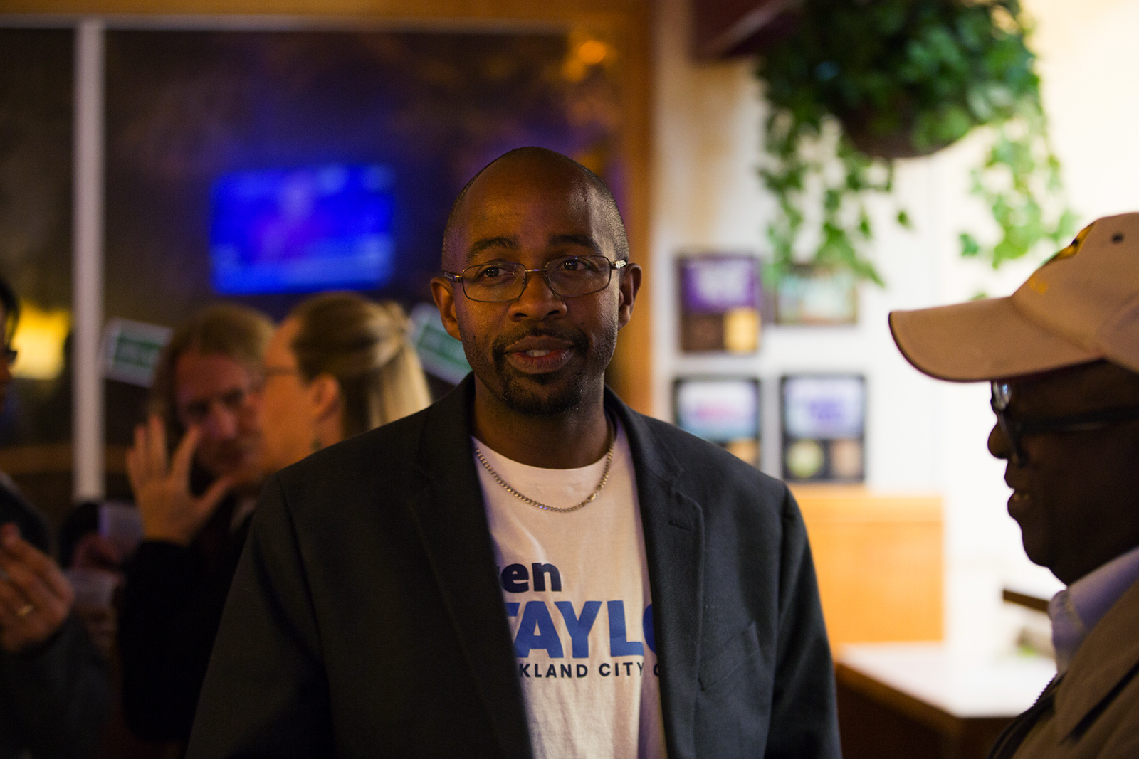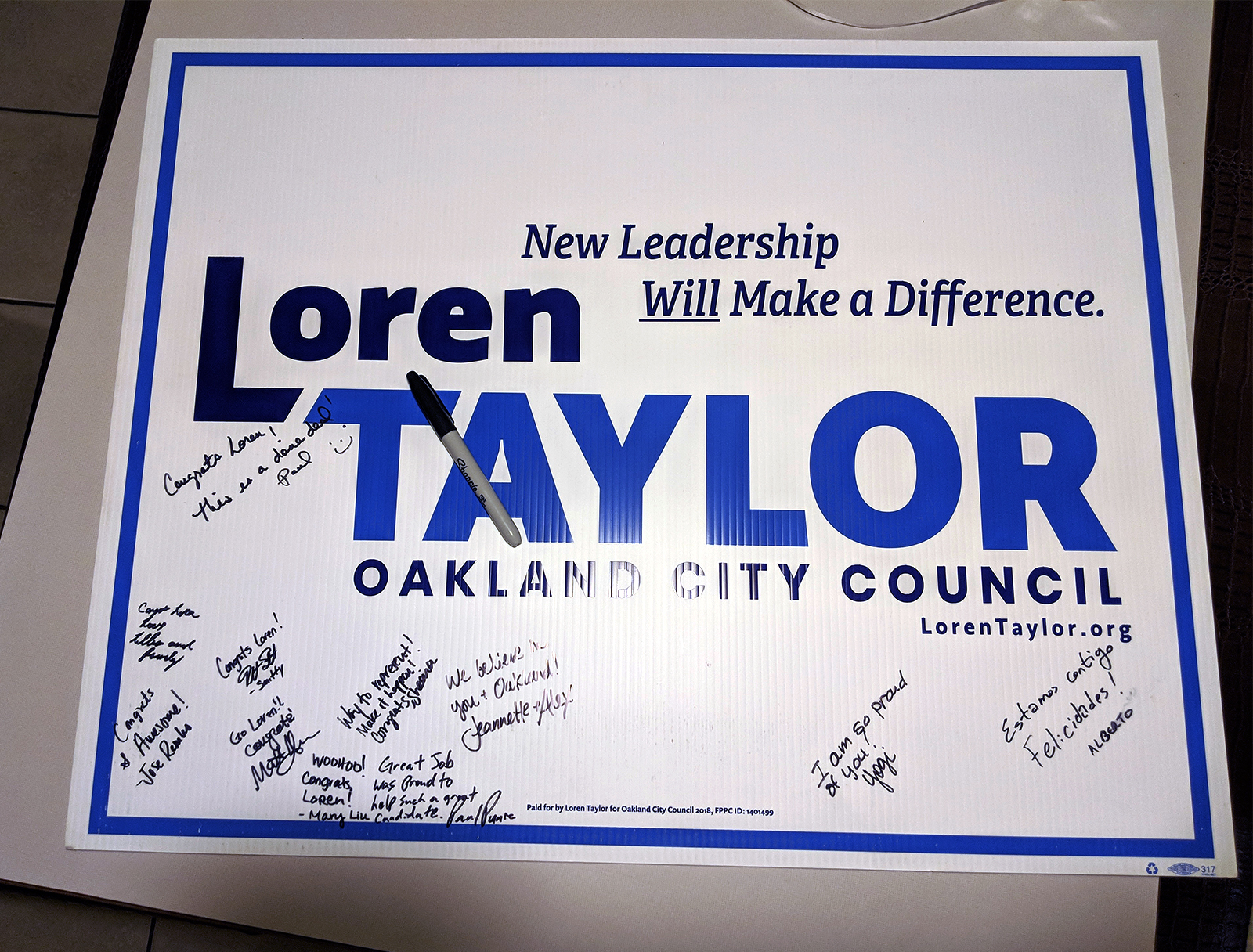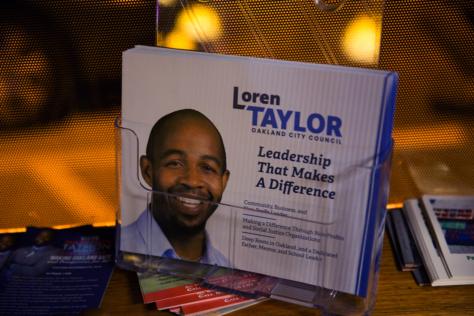 - Loren Taylor, whose campaign materials can be seen here, held his election night party at Skyline Pizza in East Oakland. Photo by Drew Costley