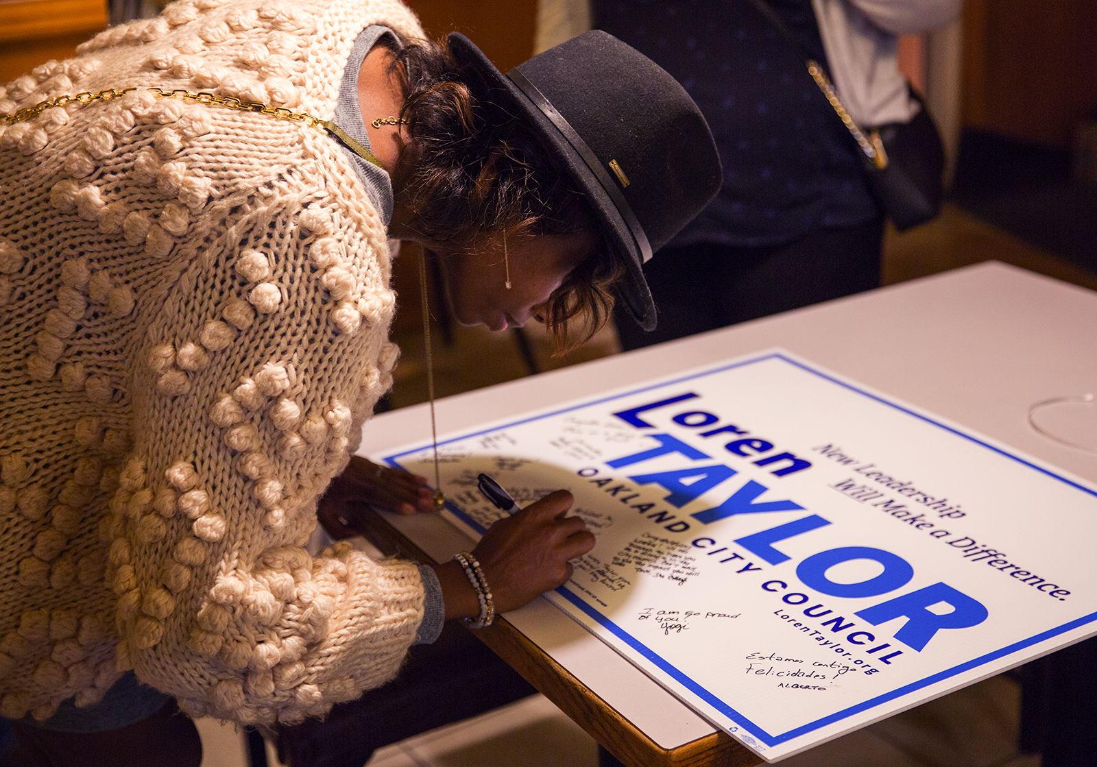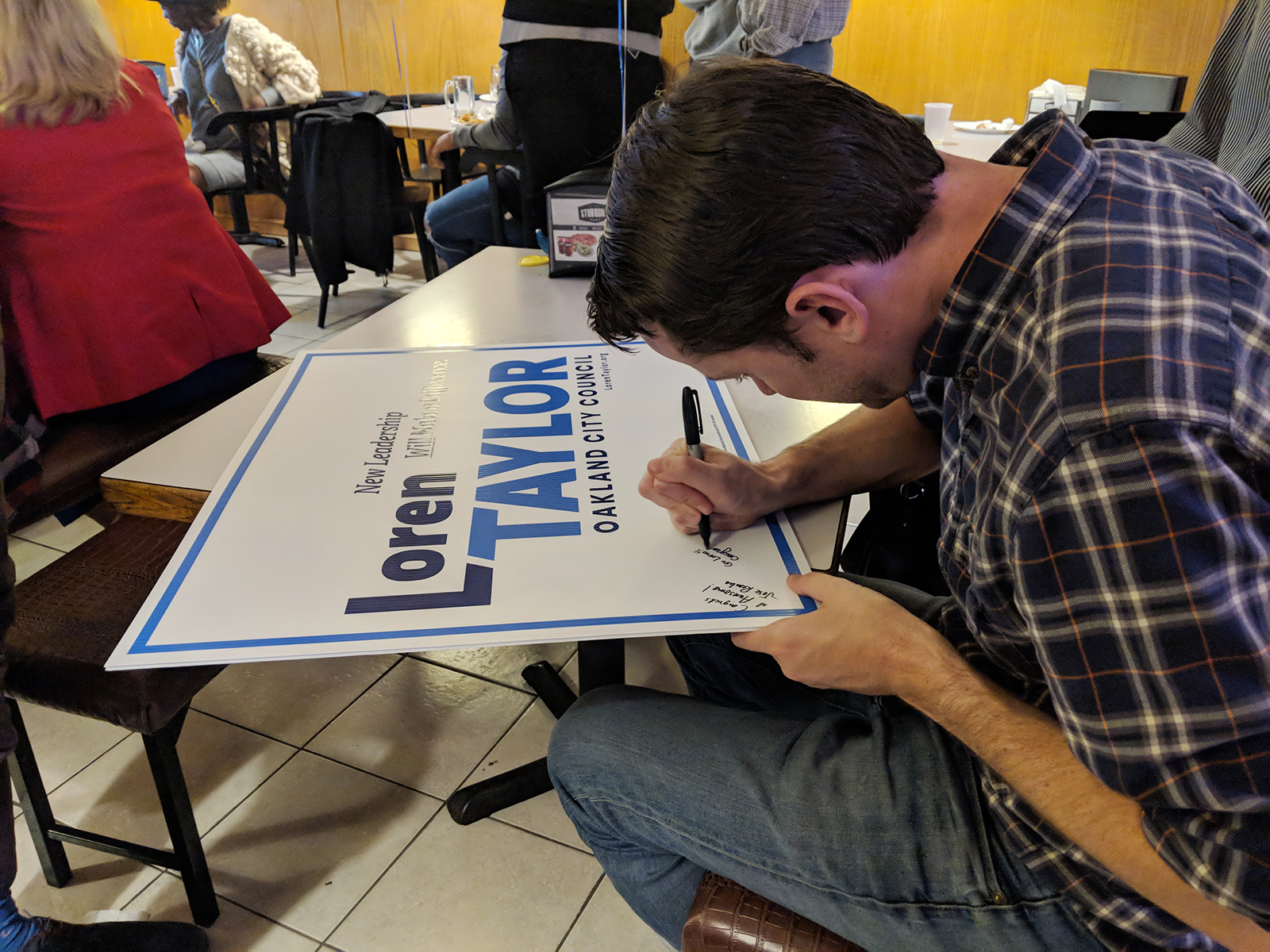 - Matt Alexander signs a campaign poster at Loren Taylor’s election night party at Skyline Pizza in East Oakland. Photo by Drew Costley
