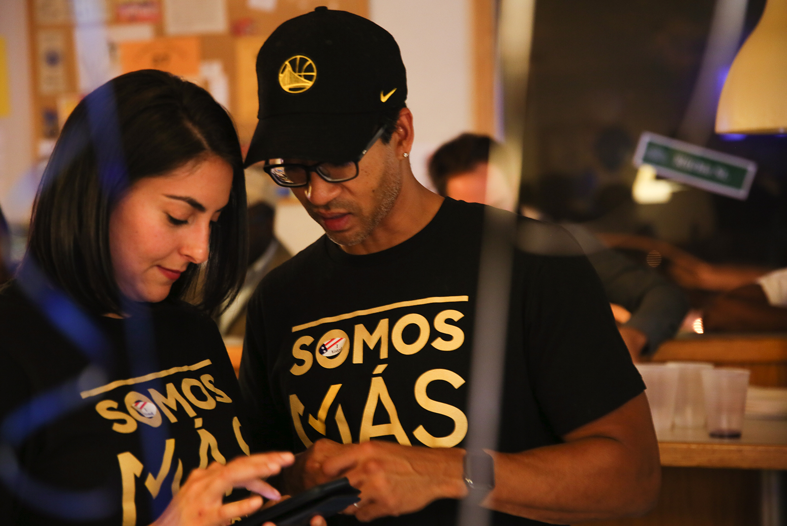 - Veronica Yazmín Allen (left) and Ché Allen look at Veronica’s phone at Loren Taylor’s election night party at Skyline Pizza. Photo by Drew Costley