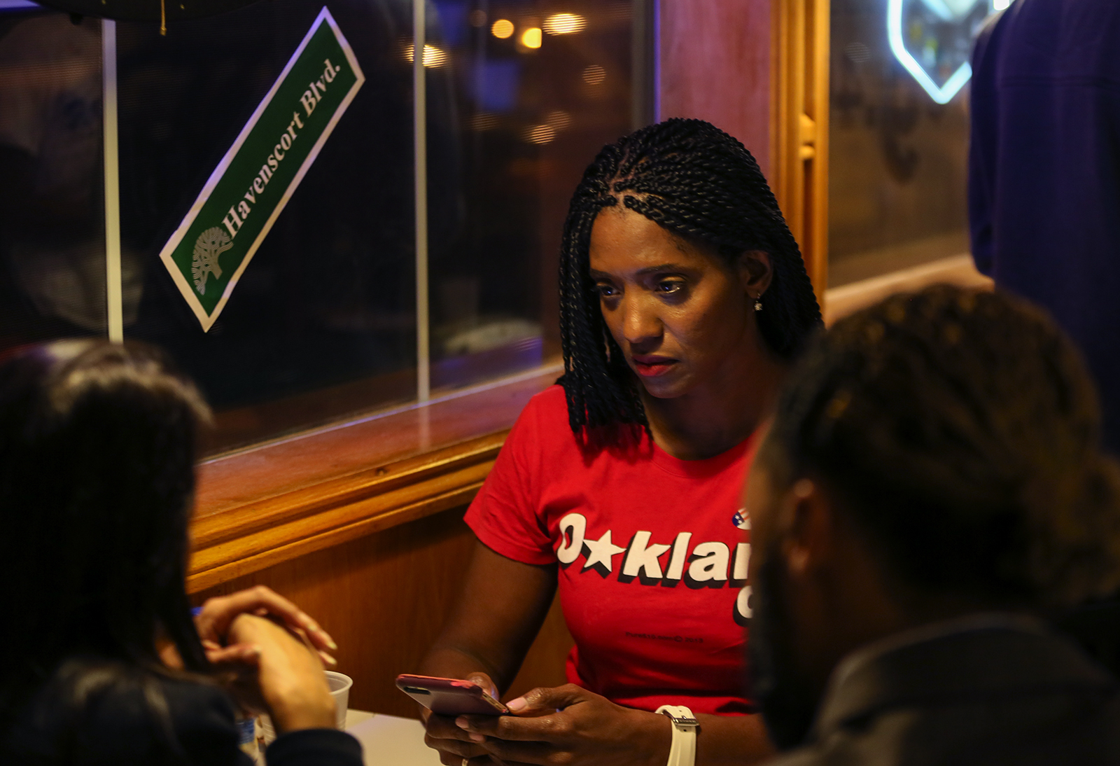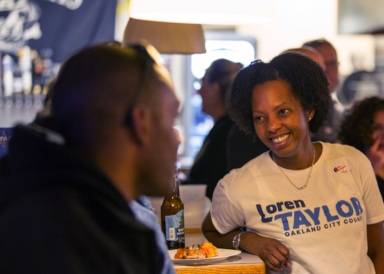 - Treva Reid, daughter of Oakland City Councilmember Larry Reid and a supporter of Loren Taylor, speaks with other supporters during Taylor’s election night party at Skyline Pizza in East Oakland. Photo by Drew Costley