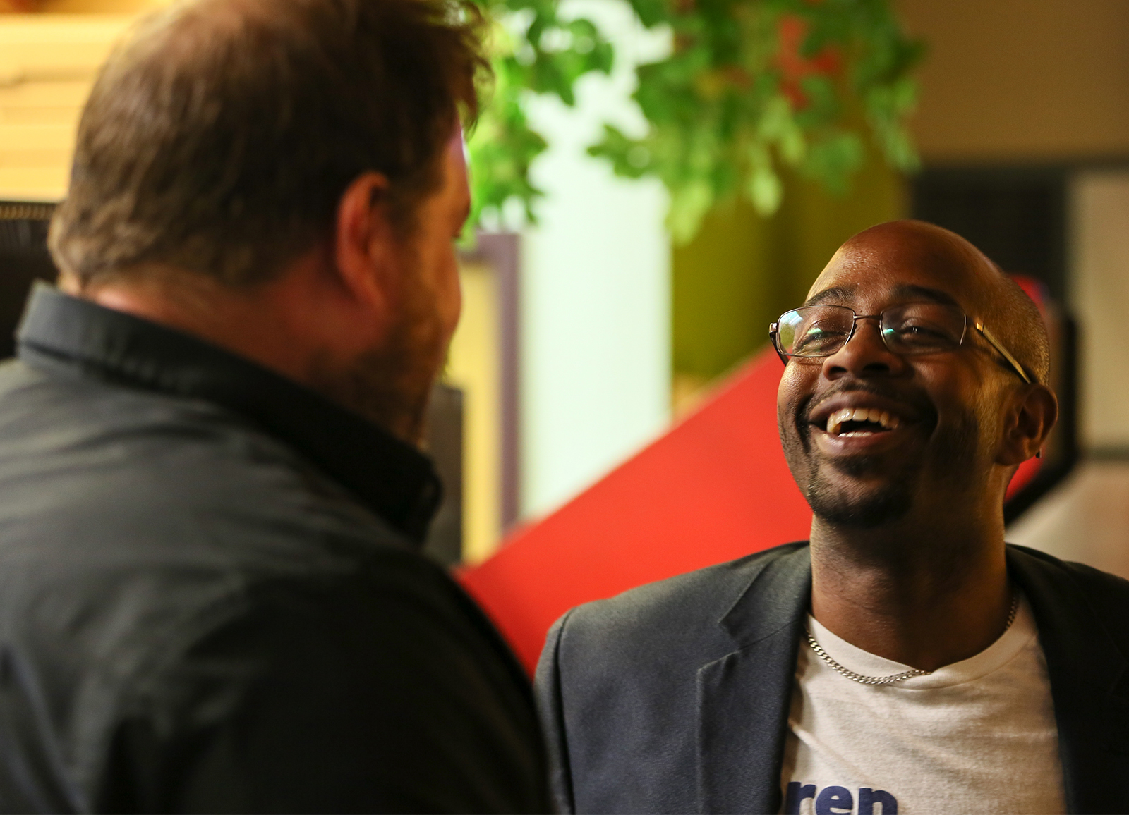 - Loren Taylor shares a laugh with one of his supporters during his election night party at Skyline Pizza in East Oakland. Photo by Drew Costley