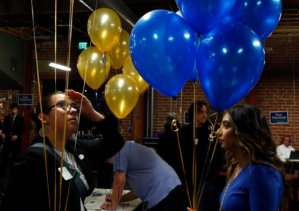 - Isabella Gonzalez, a volunteer with the Tony Thurmond campaign, prepares balloons before Thurmond’s party on Tuesday night. Photo by Mickey Capper