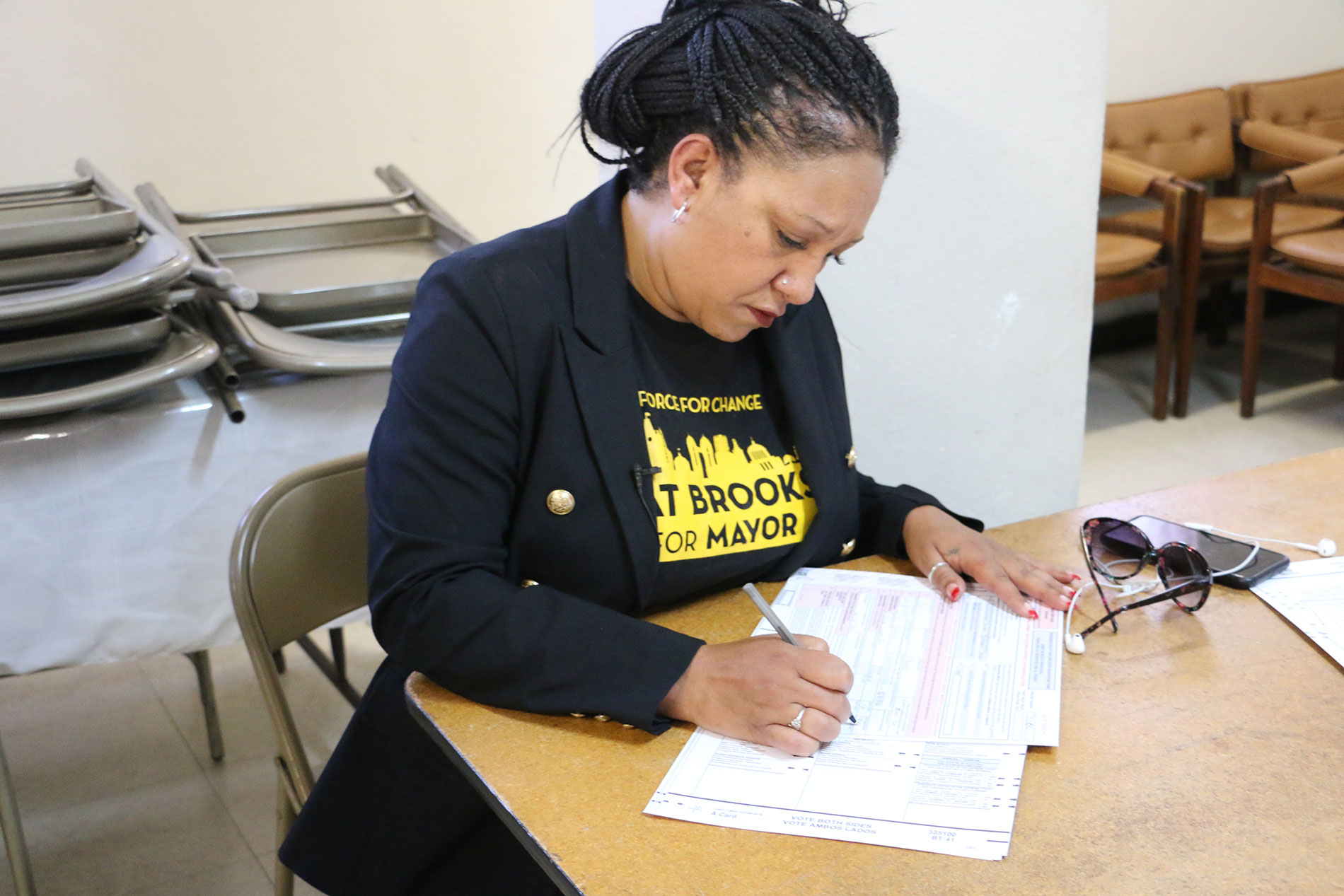 Inside the precinct, the crew followed Brooks as she filled out her ballot. The candidate smiled and laughed, asking the photographers if they could see her ballot, to which the group answered “no.”