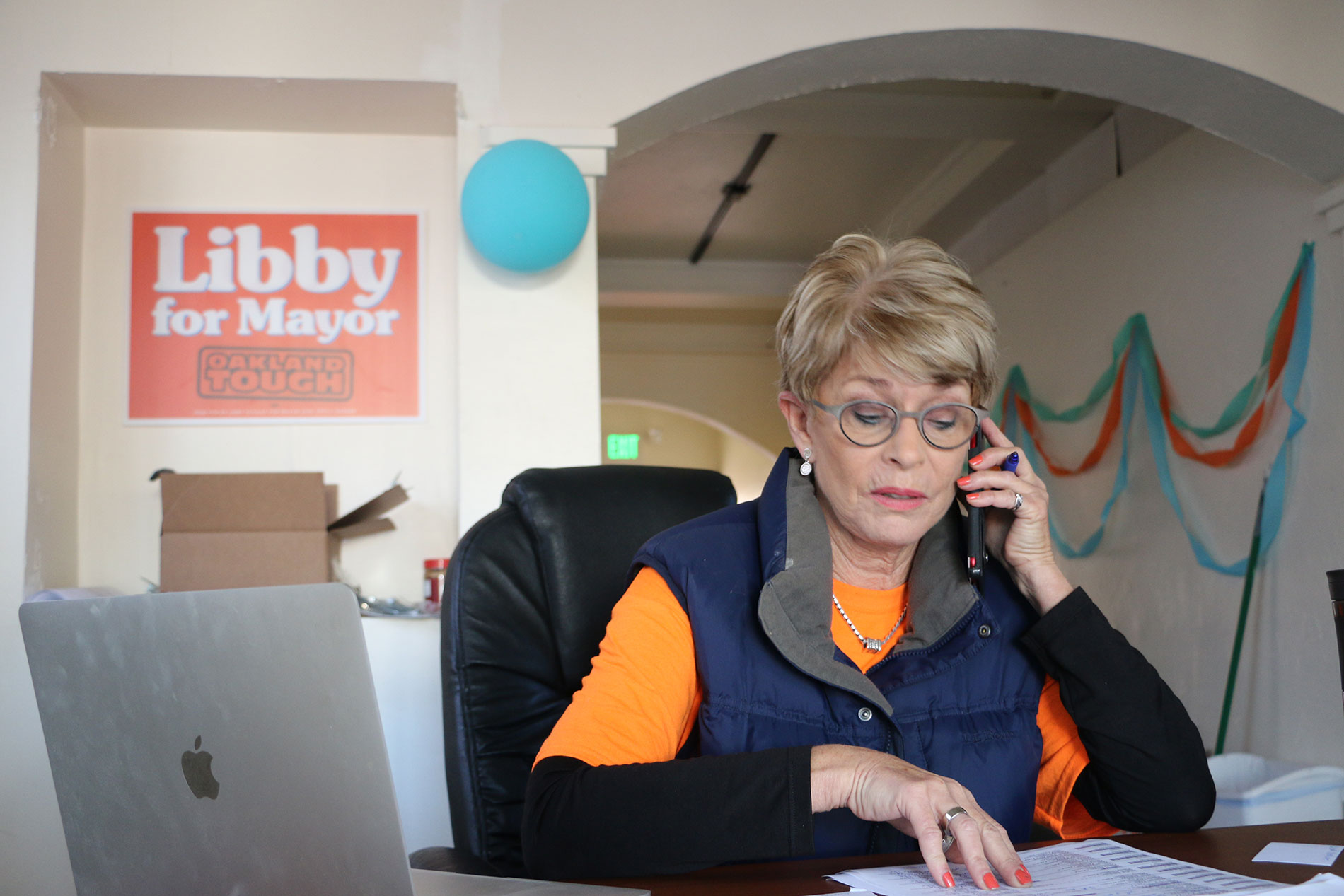Becky Taylor was working the front desk at Schaaf’s headquarters, greeting visitors and making calls to undecided voters. A longtime friend of the mayor, Taylor said she was initially skeptical that Schaaf should run for mayor. “I think subconsciously I didn’t think she was really that tough. But now she’s proved she’s tough as nails. Her campaign slogan is ‘Oakland Tough,’” said Taylor.
