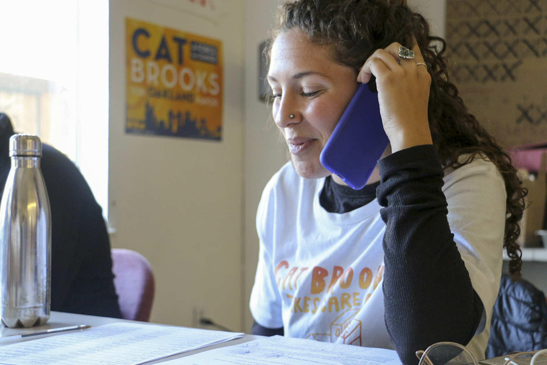 About two dozen volunteers—from Oakland natives of 40 years to high schoolers volunteering for class—phonebanked for Cat Brooks from her campaign headquarters in West Oakland. Katie Tertocha, a volunteer coordinator for the campaign, said that around 60 volunteers have come through Tuesday, helping by offering rides to the polls, dropping off campaign leaflets in East Oakland and calling voters to remind them to vote for Brooks.