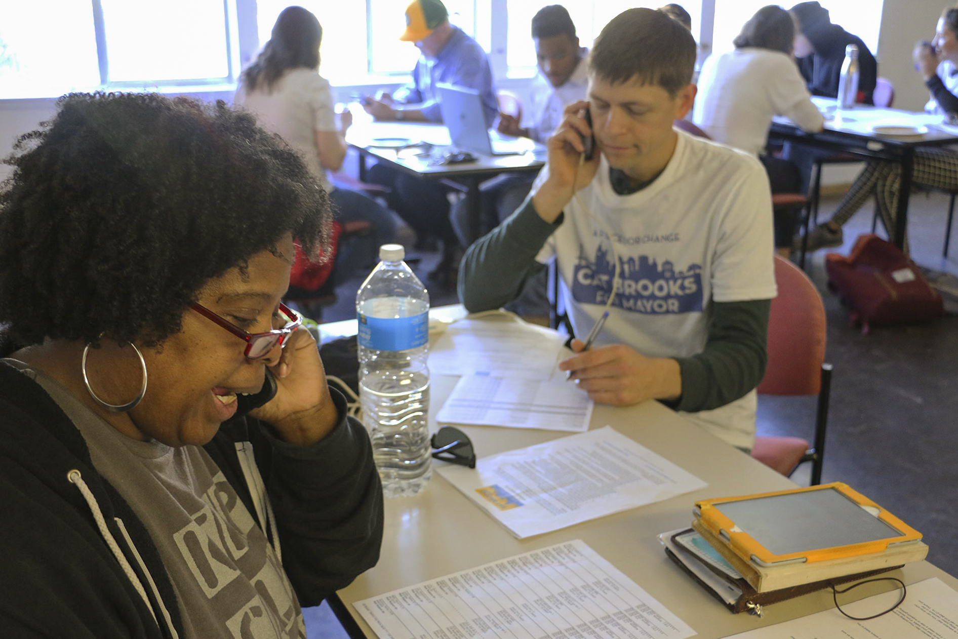 - Cherri Murphy (left) and Michael Cross (right) commit their afternoon to calling undecided voters. Photo by Katey Rusch.