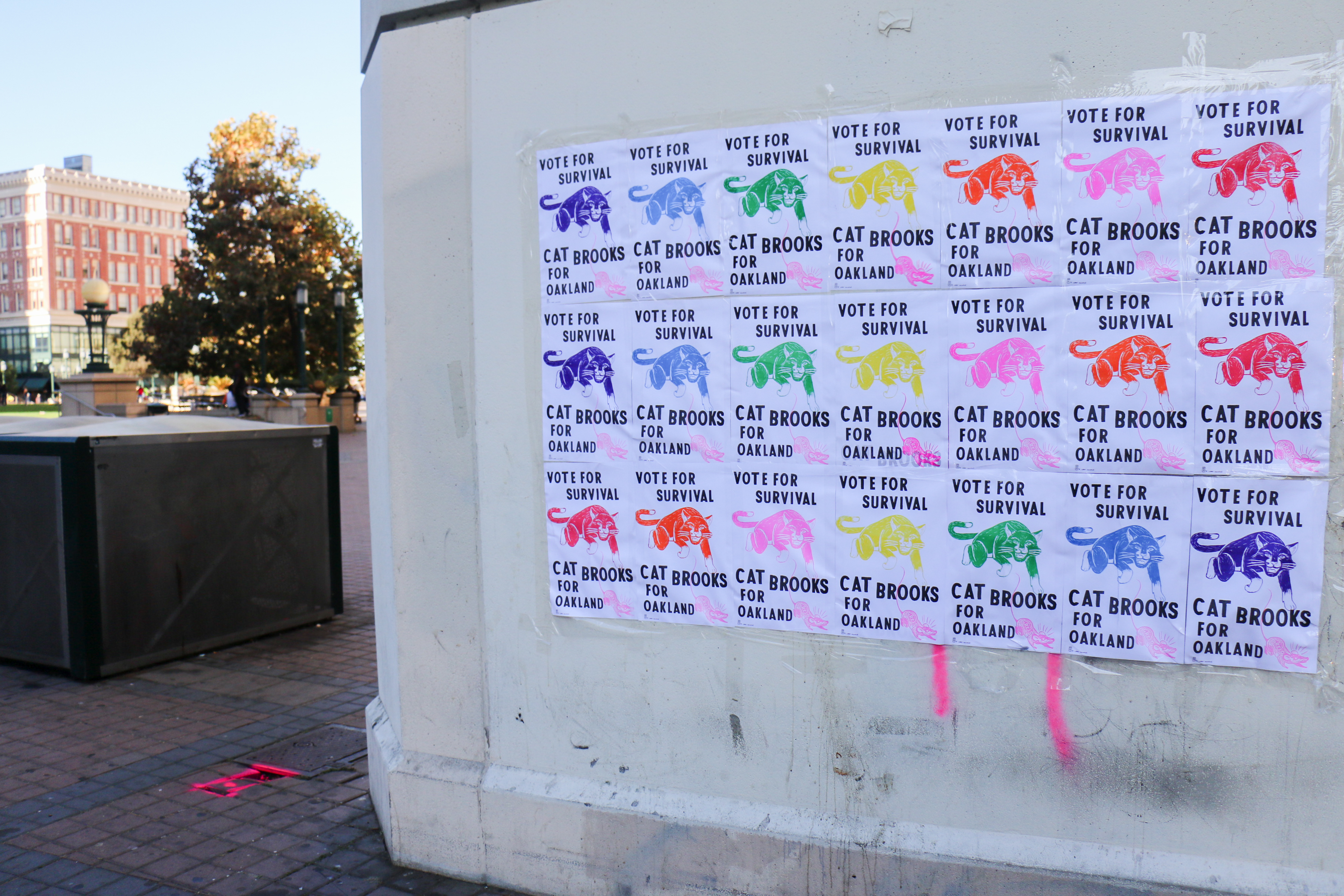 - Signs adorn a wall in front of city hall promoting Cat Brooks. Photo by Carla Williams.