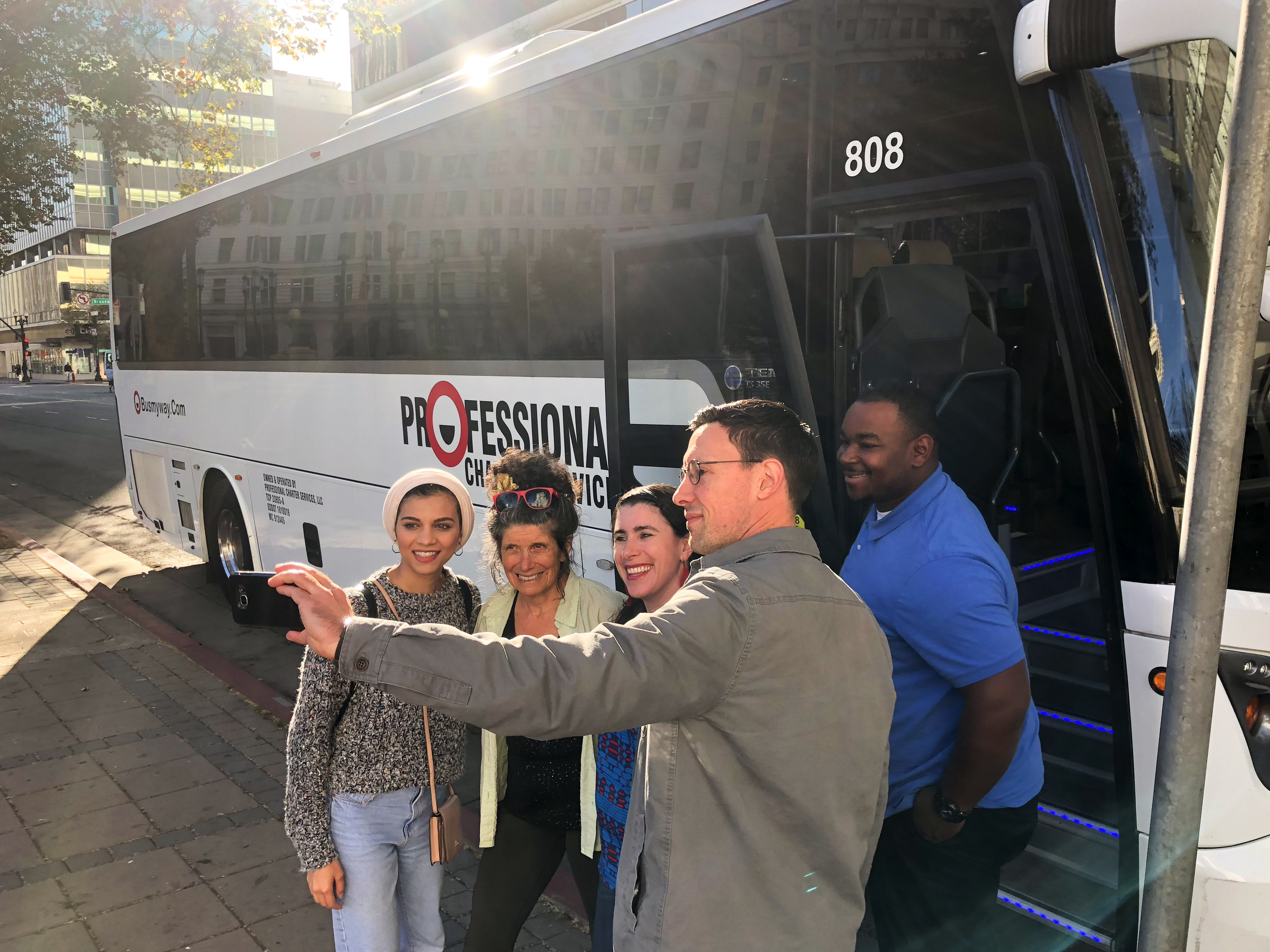 - A California Democratic Party staffer whose working on Jessica Morse’s campaign takes a selfie with Zahra Khan, Teri Gerritz, Leah Ahmadi and bus driver Londell Ireland before heading to Roseville, Calif. to campaign for Morse. Photo by Mickey Capper.