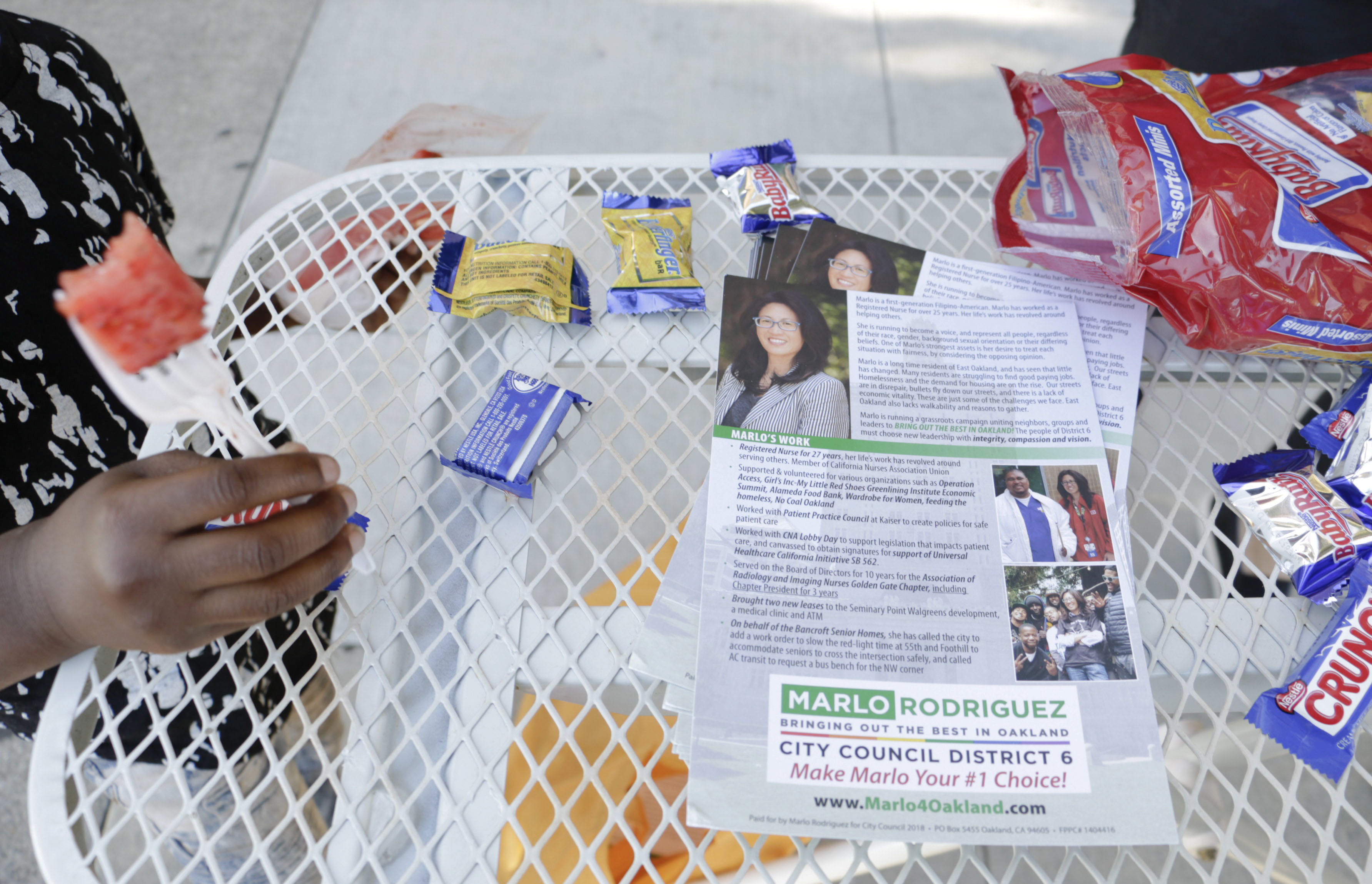 Marlo Rodriguez, another candidate for District 6, was canvassing outside Frick Impact Academy around pick-up time at 3 p.m. She and her wife, Katherine Webb, had set up an ironing board table with a banner, flyers and candy. Rodriguez says they were modeling their set-up after Bakesale Betty’s ironing board table on the street so it wouldn’t block the sidewalk. “This is truly a grassroots campaign. My strongest point is the person-to-person contact. They know I’m a registered nurse. I’ll take care of our community,” Rodriguez said. She went on to say if she doesn’t win today, she will stay engaged in East Oakland and “may make another go of it.”