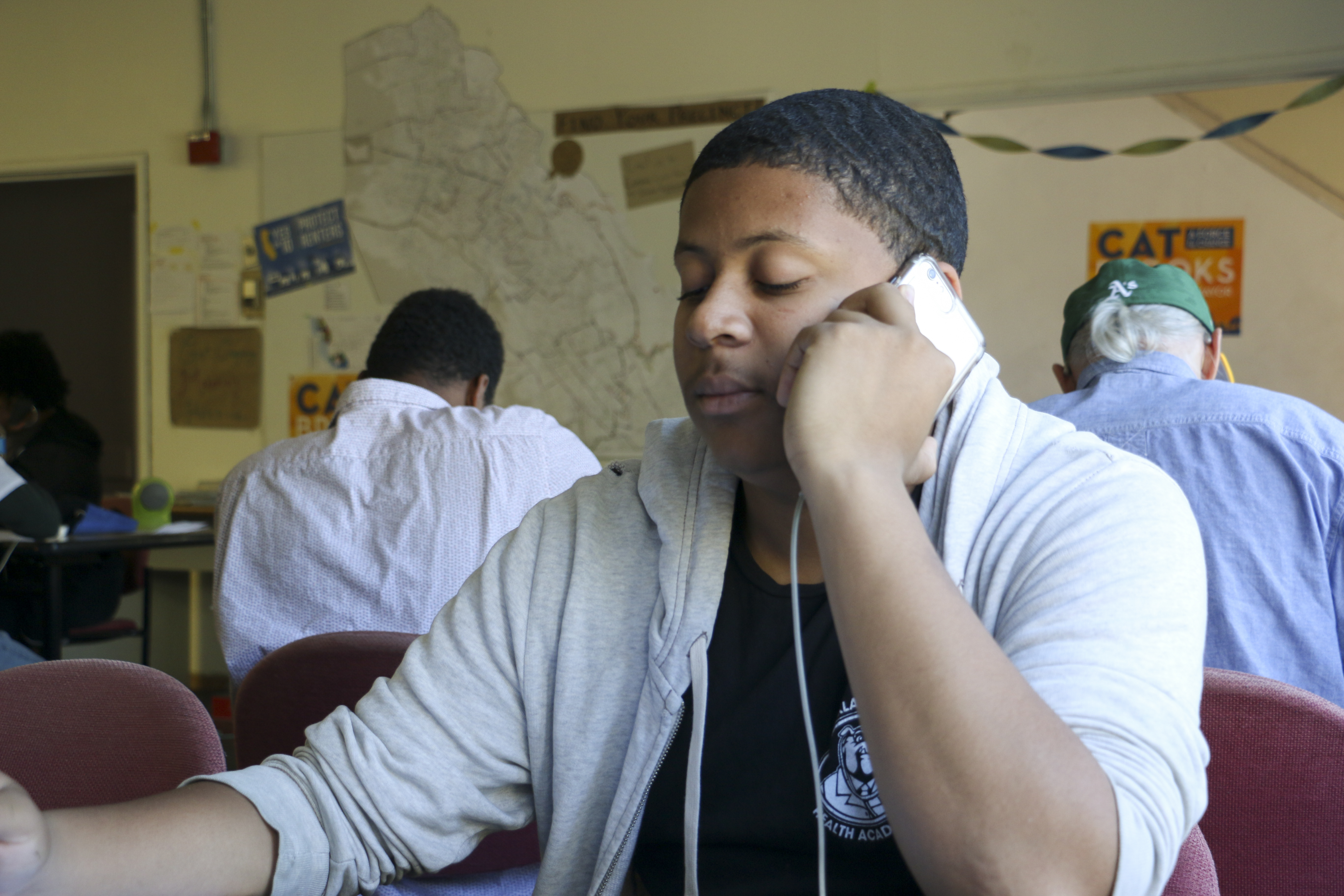 - Christian Spencer, 17 years old, is volunteering at Cat Brooks’ campaign as a part of his government class at Oakland Technical High School. Photo by Ali DeFazio.