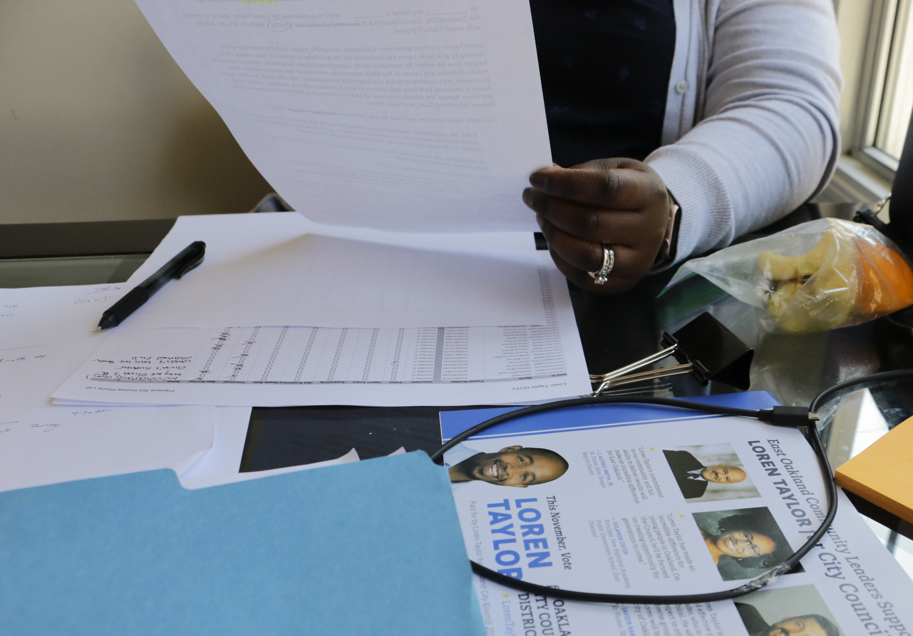 Cherri Murphy, a Lyft driver, has been with the Cat Brooks from Mayor campaign since it started in July. On Tuesday afternoon, she sat at a folding table with a sheet of numbers in front of her, calling voters. She’s hopeful that Oakland will elect a new mayor. “I’m feeling really good about it,” said Murphy. She said she’s optimistic because every Oakland passenger she talks to is voting for Brooks. When asked why she is not supporting the current mayor, she chuckled.
