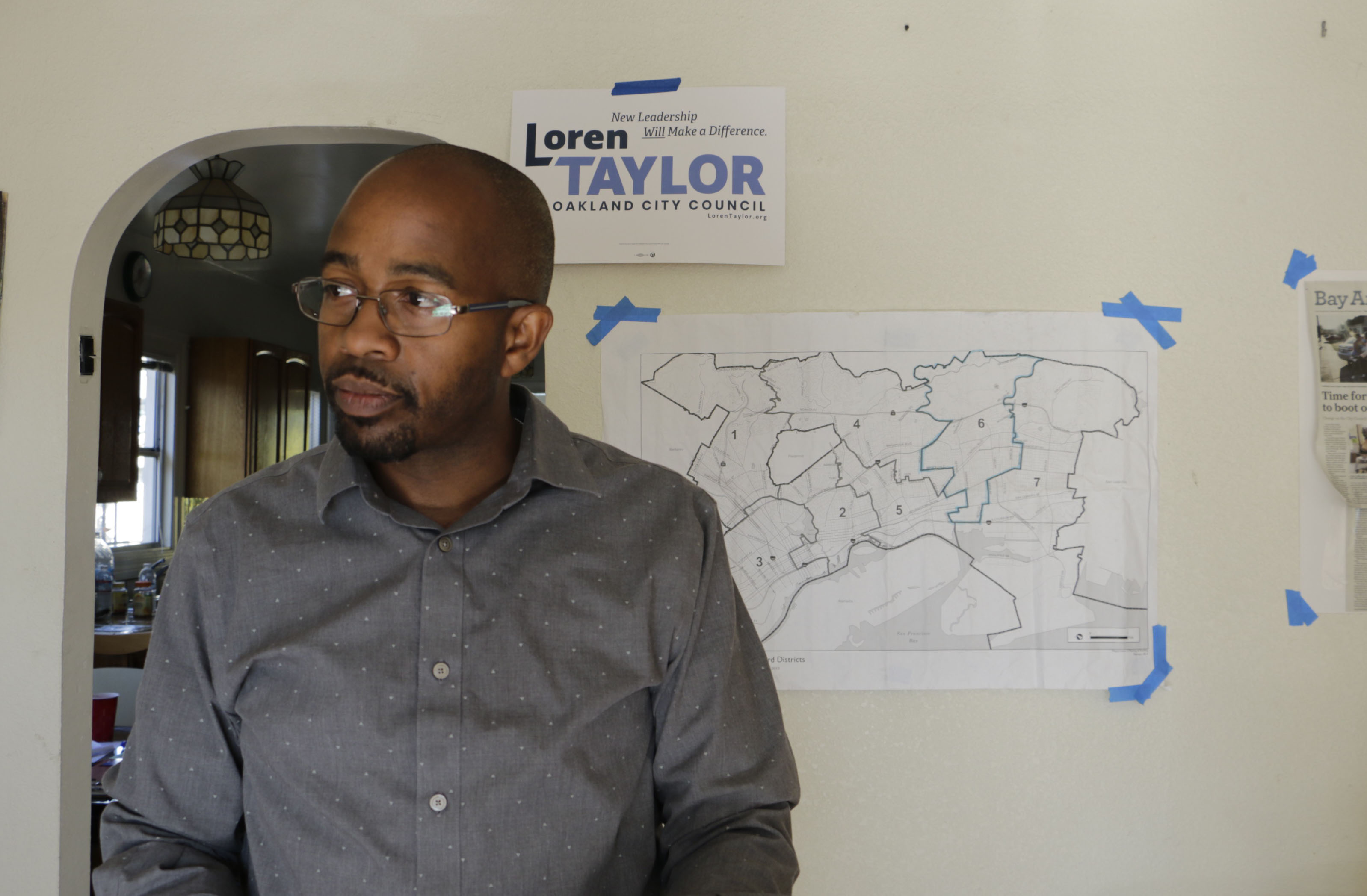 - Candidate Loren Taylor standing in his campaign headquarters in Oakland. Photo by Shuang Li.