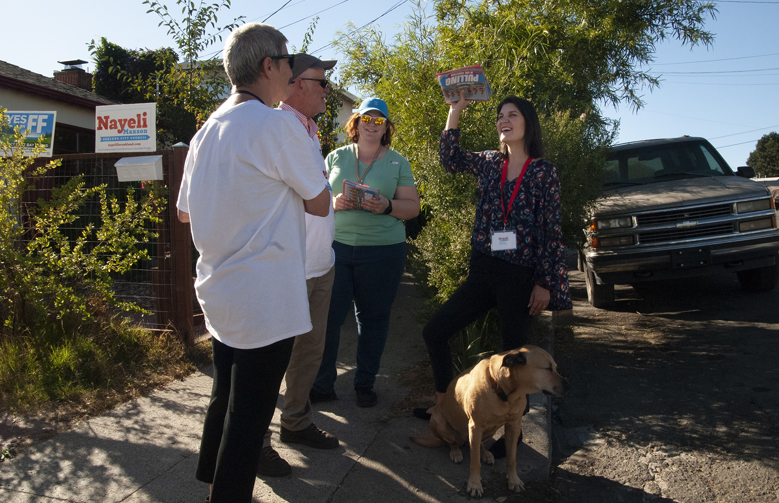 - District 4 candidate Nayeli Maxson (right) and her campaign manager, Toni Gomez, are joined by Maxson’s parents for last-minute canvassing. Maxson’s mother, Nancy Mullane, said after spending her career as a journalist being unable to publicly endorse candidates, she’s enjoyed supporting her daughter in a “great race.” Photo by Sarah Trent.