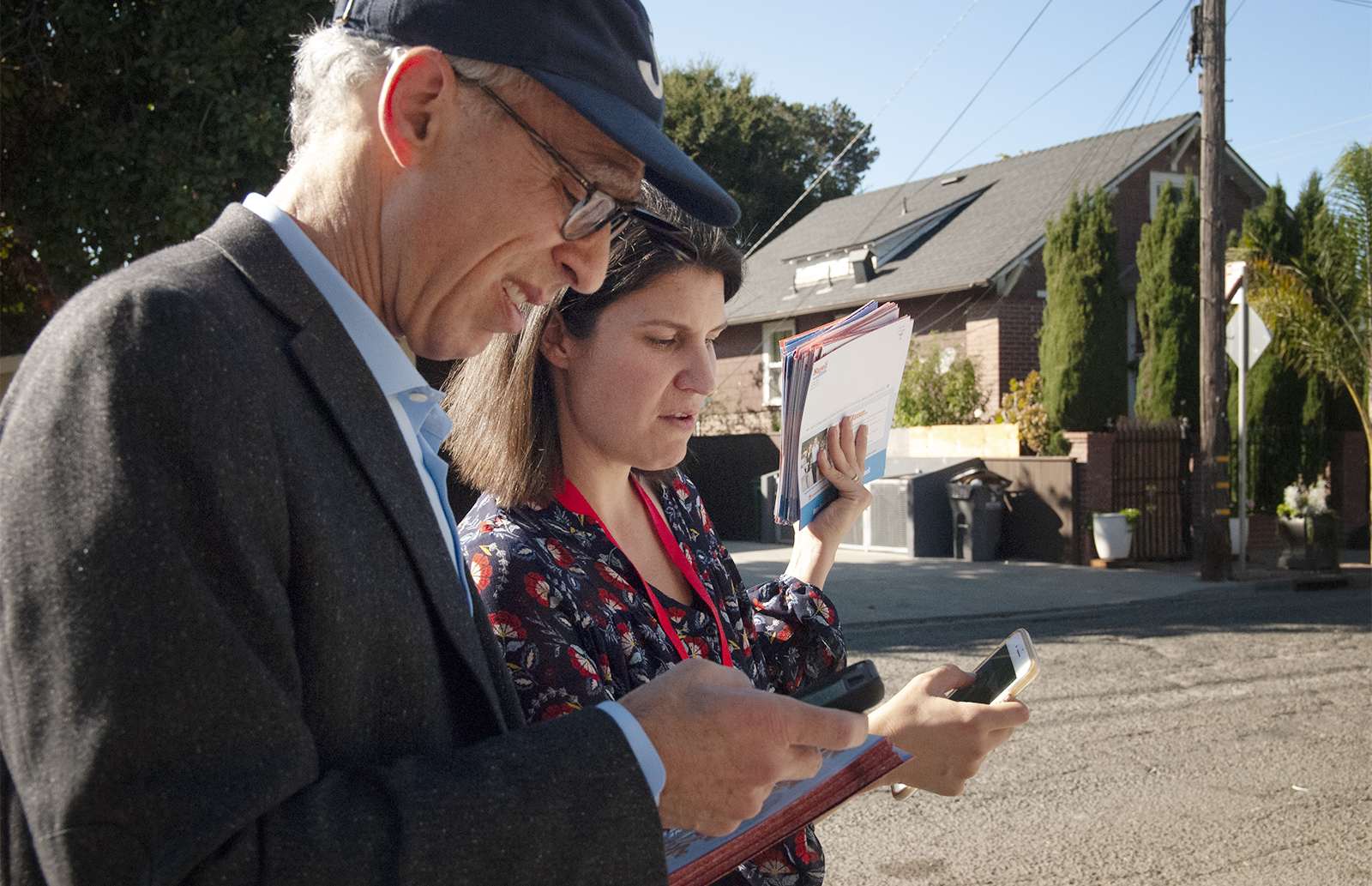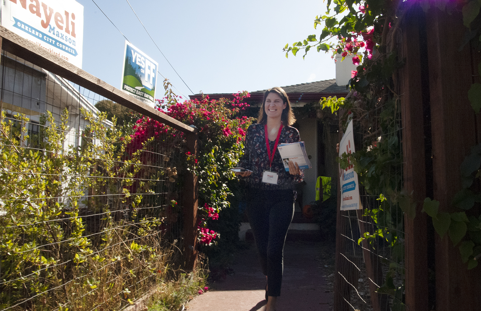 - District 4 candidate Nayeli Maxson was joined by District 1 councilmember Dan Kalb to make calls and go door to door to reach voters in last-minute efforts to get out the vote in District 4. They focused especially on the neighborhoods below Highway 580, which are lower income and more diverse than the rest of the district. Photo by Sarah Trent.