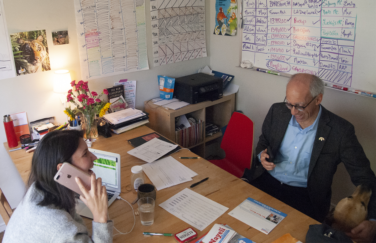 Campaign signs for District 4 candidate Nayeli Maxson dot her neighborhood. On Tuesday afternoon, Toni Gomez, Maxson’s campaign manager, was at her house, which she has chosen for the Election Day headquarters for her camp. “This is our campaign dog,” Gomez said, introducing Maxson’s pet to reporters. Sitting District 1 councilmember Dan Kalb was with Maxson in her office as she made last-minute “get out the vote” calls.