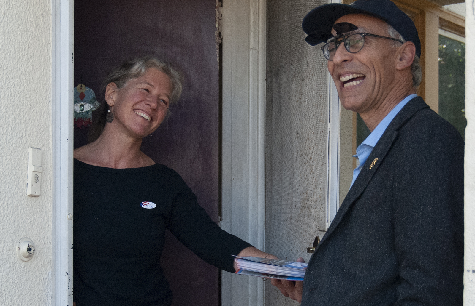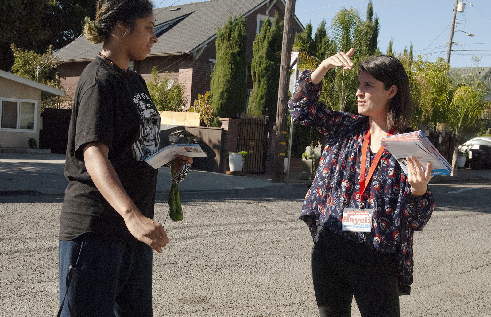 - Oakland City Councilmember Dan Kalb canvased with District 4 candidate Nayeli Maxson on Tuesday morning. He spoke with voters like Kristen Zimmerman, who had already voted, and others who are still researching candidates and measures on the 4-page ballot. Photo by Sarah Trent.