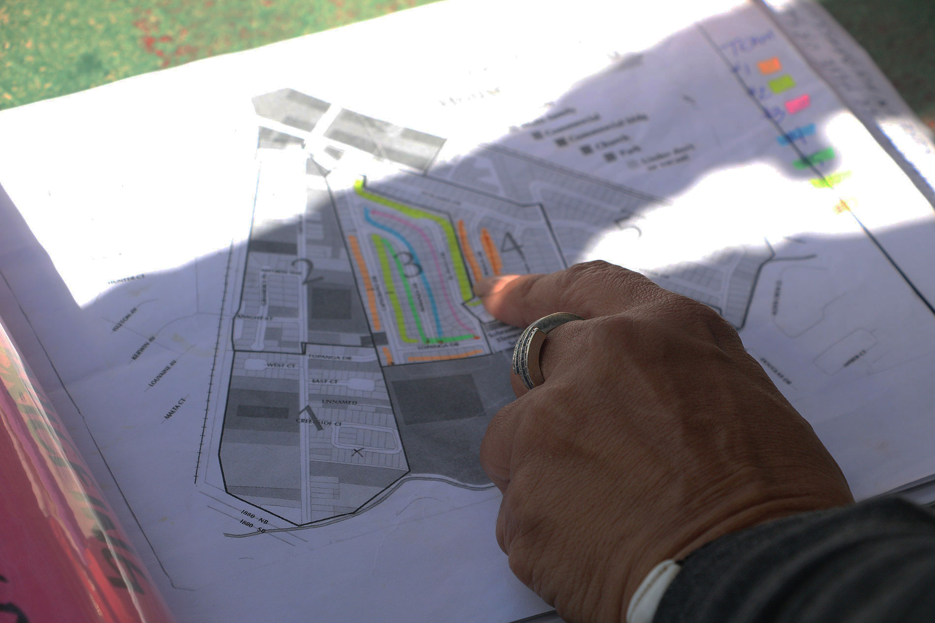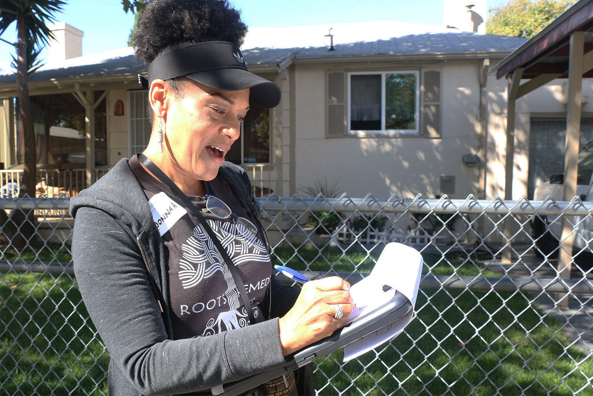 - Donna Anderson marks on a map the house number she just visited in Sobrante Park as she makes her way through the neighborhood Saturday morning.