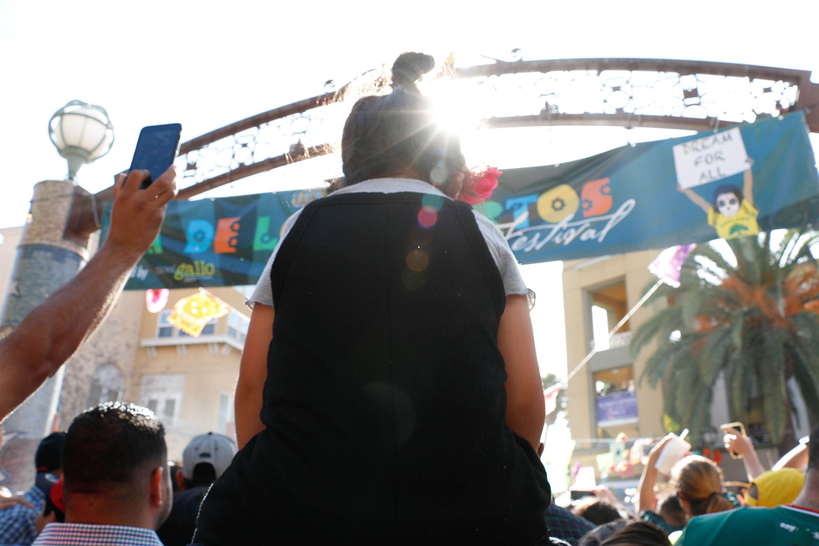 - A child sits on an adult’s shoulders to see above the dense crowd during one of the traditional performances by Aztec dancers at the Unity Council’s Día de los Muertos festival on November 4. Just ahead, a sign hangs from a neighborhood arch, with artwork by local artist Eduardo Chaidez.