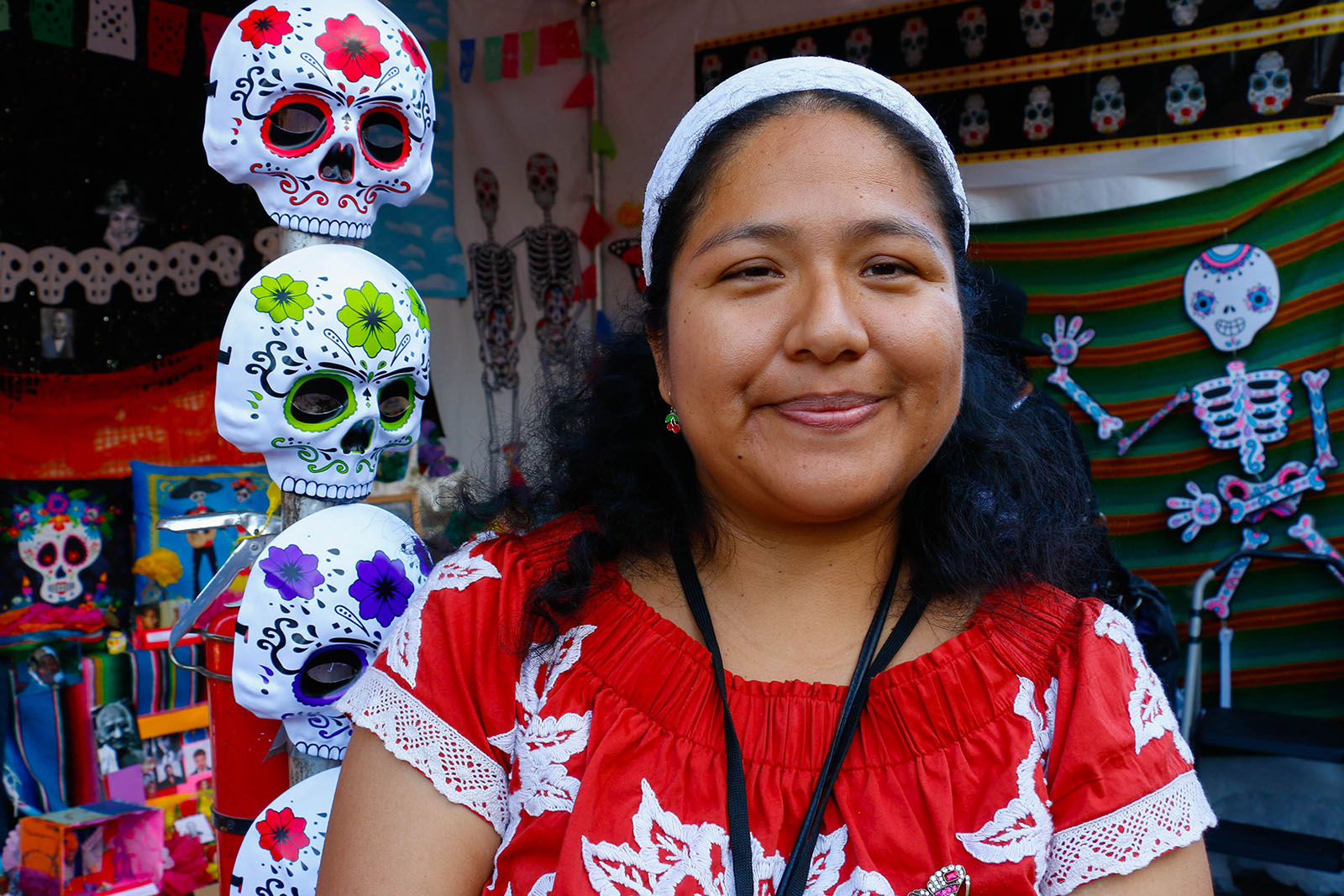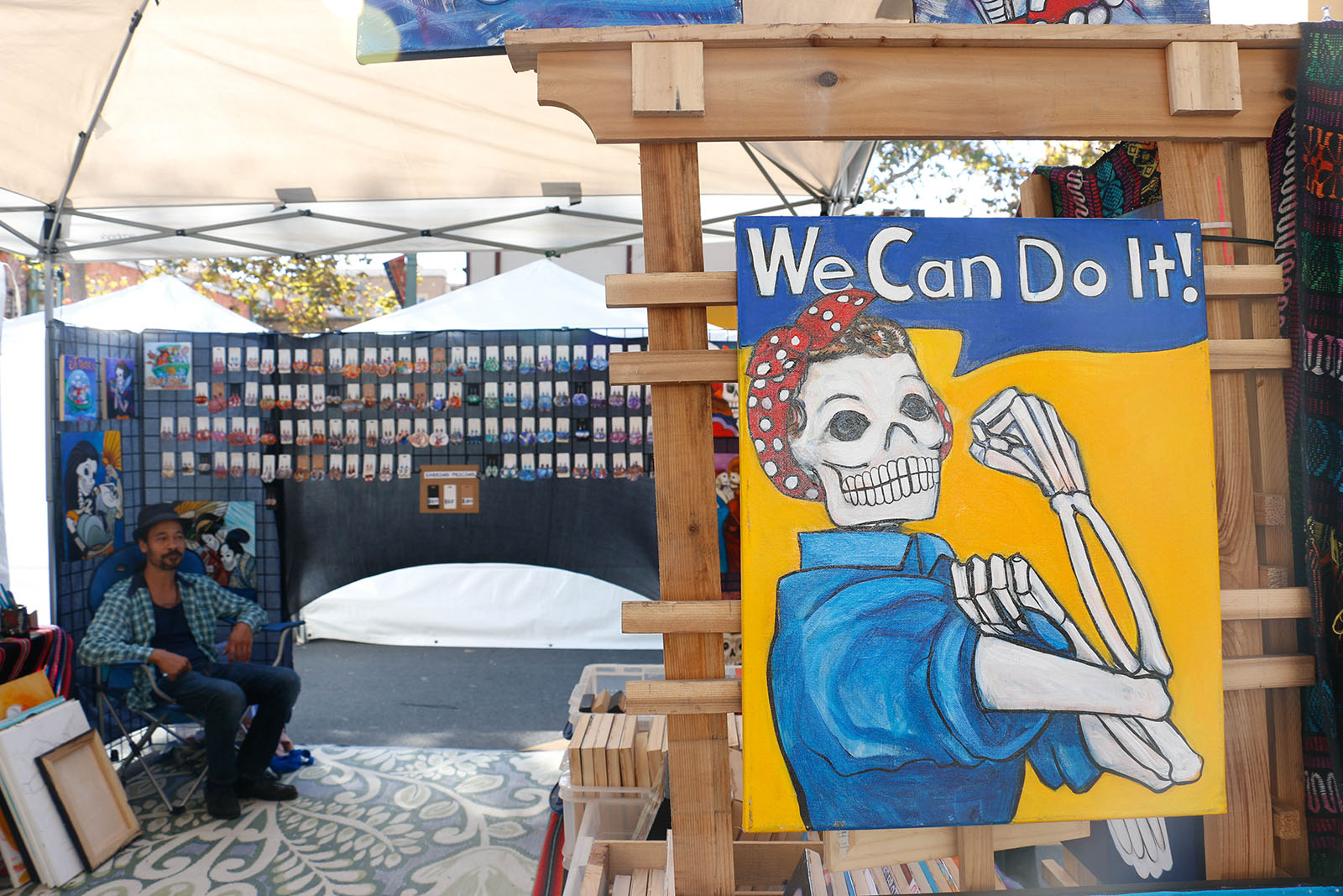 - Artist Sean Levon Nash sits inside his stand as customers peruse nearby. Nash, who was a regular at the festival 15 years ago, started going back more regularly the last few years. He sells Día de Los Muertos-themed paintings and jewelry, like a poster that combines skeleton motifs with Rosie the Riveter.