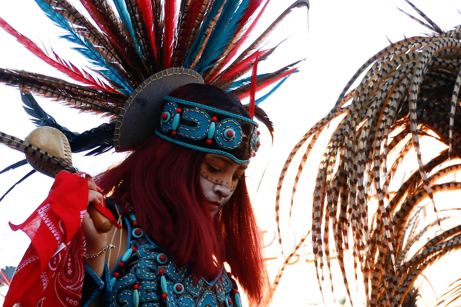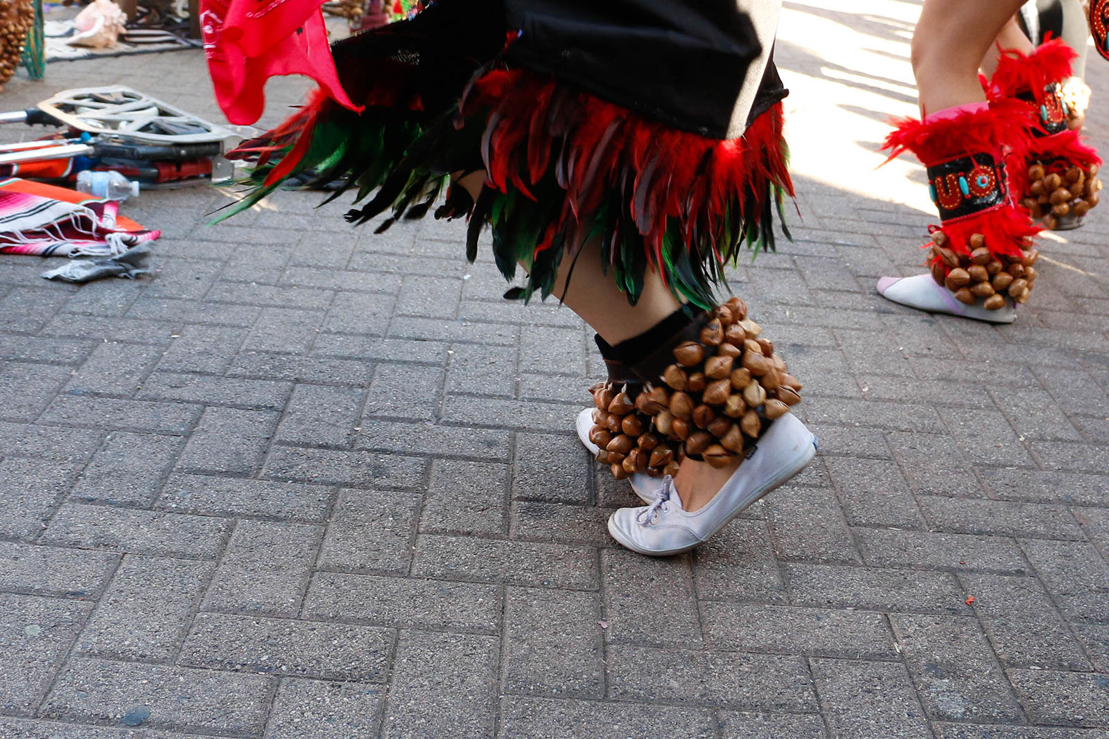 - Two traditional Aztec dancers add percussion to the group dance through ayoyotes worn on their ankles.