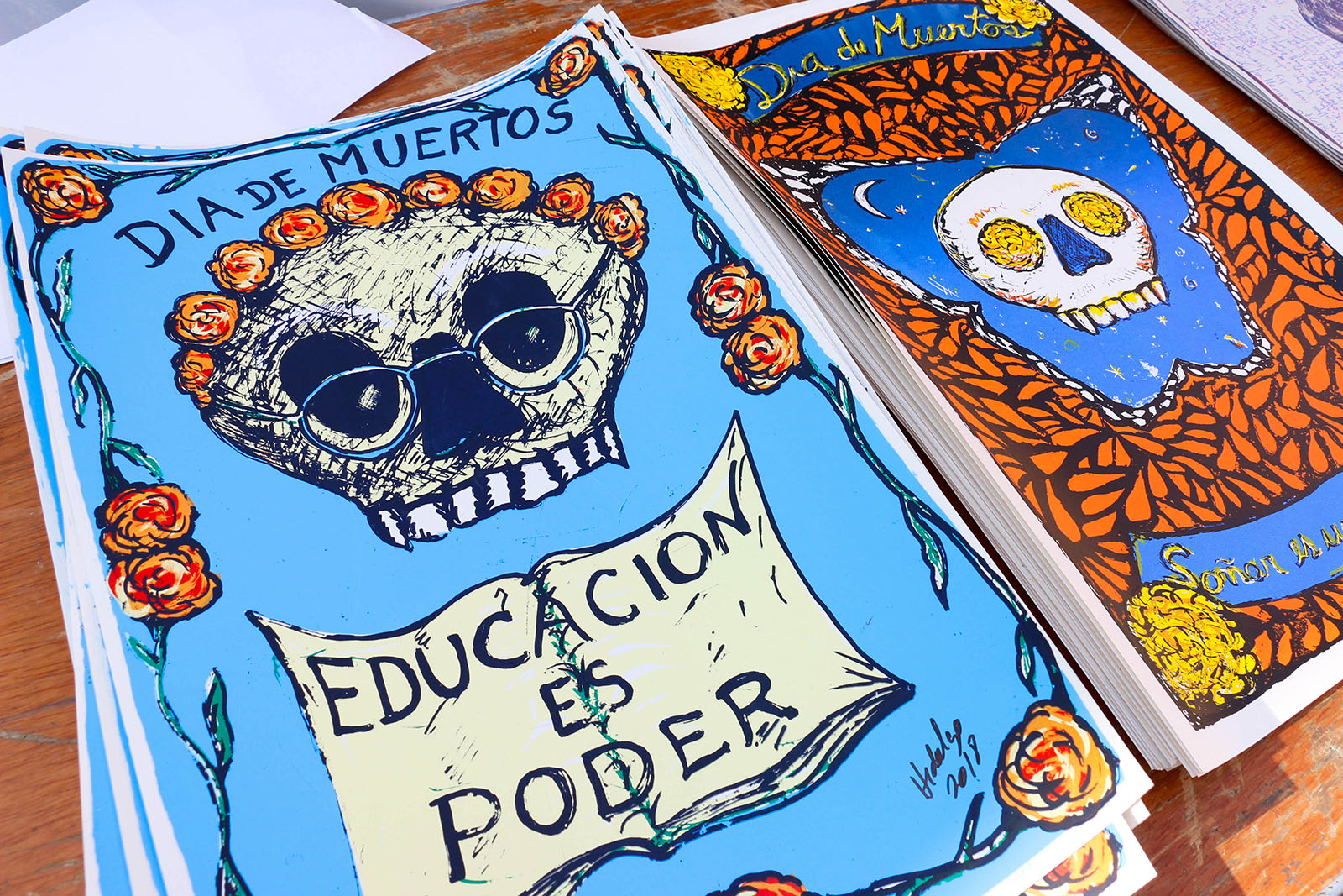 - A table nearby features screen prints by Gonzalo Hidalgo. One poster reads, “Educacion es poder,” or “Education is power.” Another reads, “Soñar es un Derecho,” or “To Dream is a Right,” the title of his installation.
