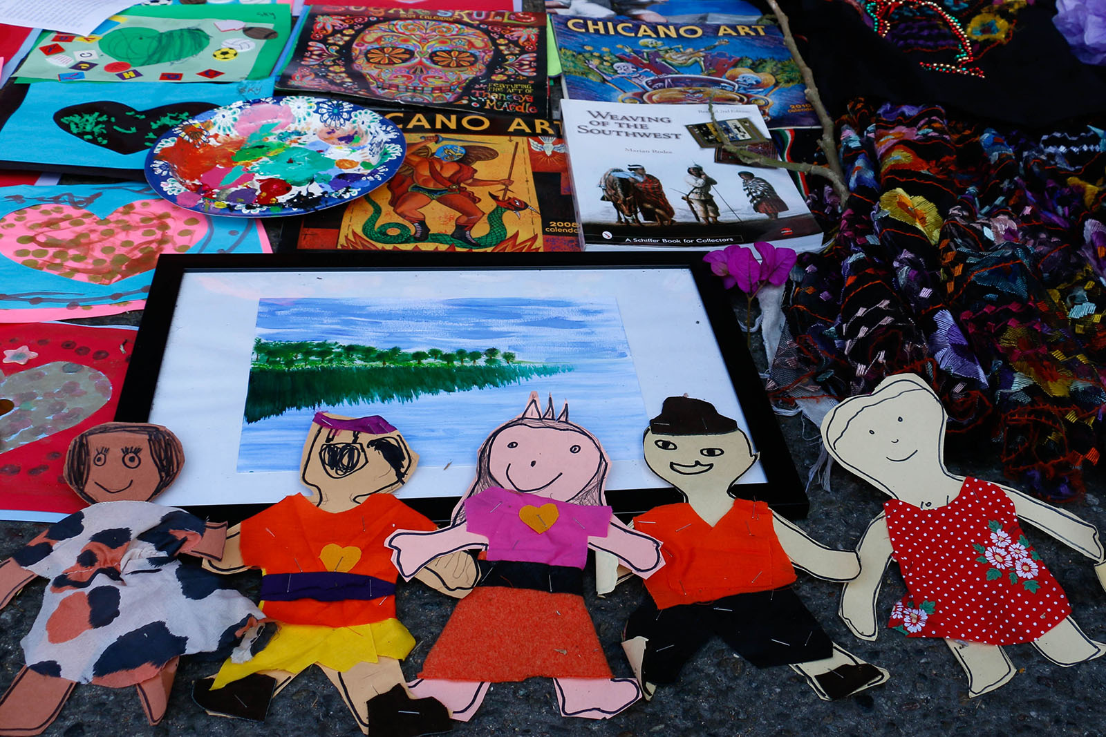 - Artwork by Nash hangs inside his stand at the Unity Council’s festival. His work is concerned with memory, narrative, and color—exploring both traditional images and satire.