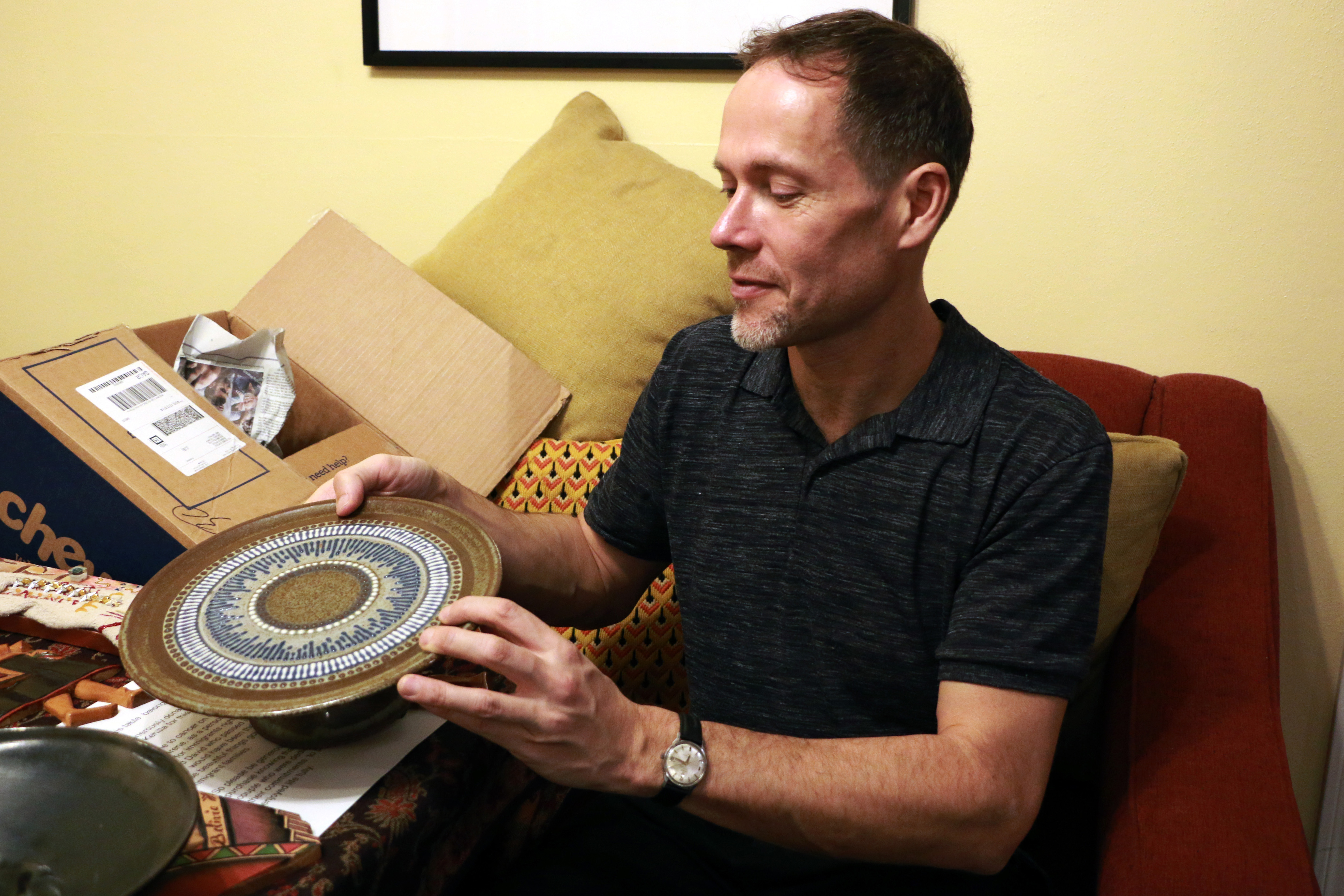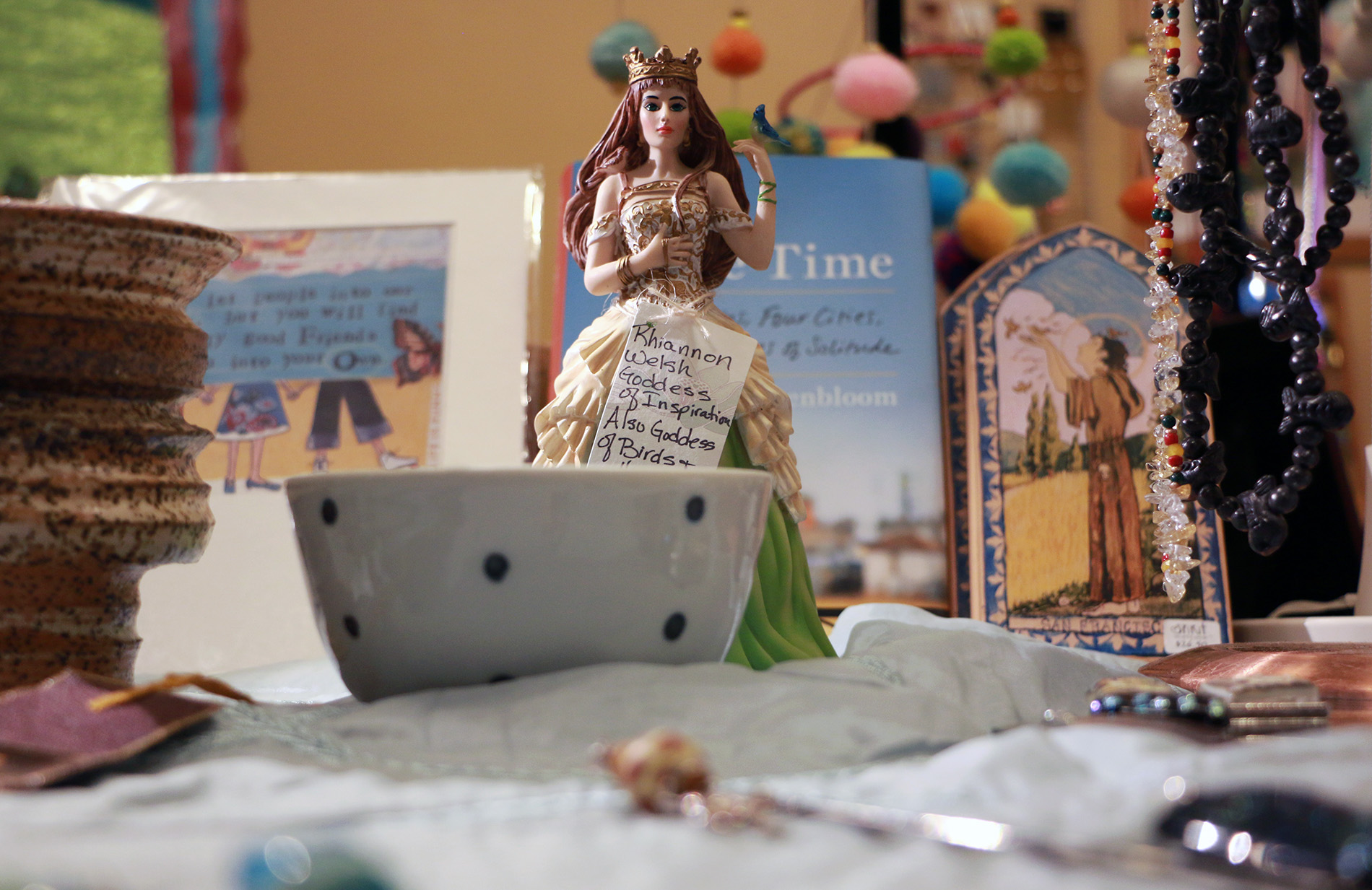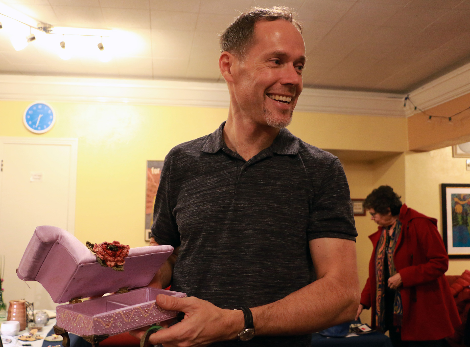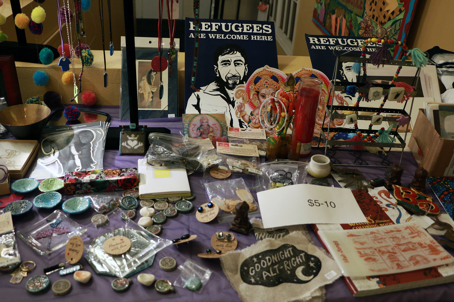 Davis makes his way to the most popular table of the night. The table at the front of the gallery features the possessions and creations of congregation member Irene McPhail, who passed away from cancer earlier this year. Her daughters donated five boxes of her belongings to the fair. McPhail was from South Africa, and grew up during Apartheid, when she first became an activist. After moving to the US, she became a therapist and worked in immigration reform. Her husband, David McPhail, a minister, worked with Lee to lead prayer vigils at the West County Detention Facility. Most of the people at Kehilla have family who are immigrants, Rothman says, which is why so many of their members care so deeply about immigration reform.