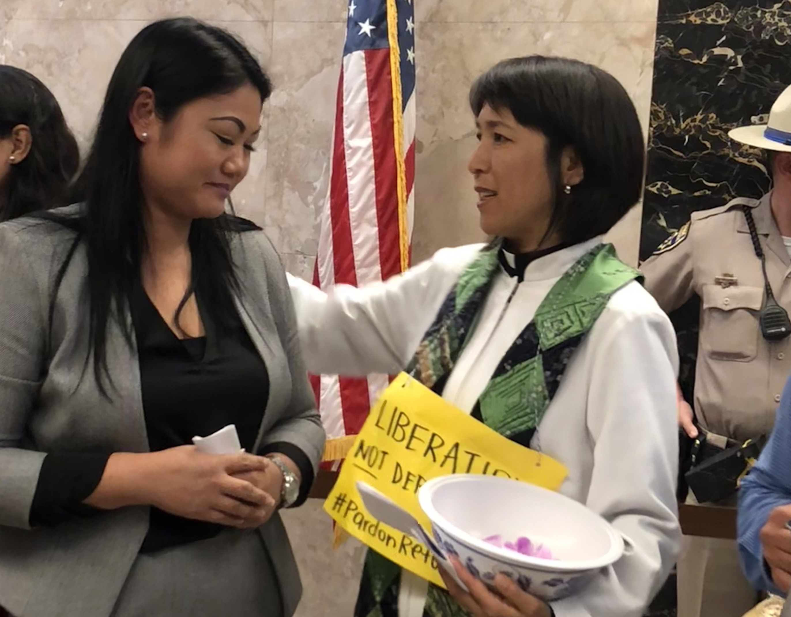 As they arrive in Sacramento, Lee and Gottlieb greet the dozens of people gathered in the lobby of the California State Capitol to participate in a rally. Lee has changed into her long white clerical robes, and Gottlieb is looking over the remarks she has prepared for today, her glasses perched on the bridge of her nose, a long scarf draped around her shoulders. Attendees hold chains of paper cranes and signs that read: “Pardon is an act of faith.” Security guards stand by, clearing a space for passersby. Many of those gathered in the lobby seem to know each other, and the mood in the room is solemn but hopeful.