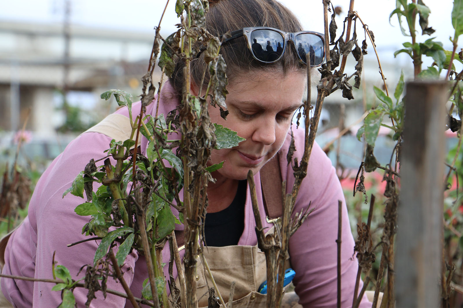 - After finishing up with the bouquets, Velasco worked on removing dead flowers and branches on the farm. She finds this type of work peaceful. “It kind of de-stresses me to work outside and work with my hands like this,” she says.